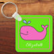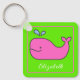 This cute personalized keychain features a preppy whale in shades of pink and blue on a background of bright green. Personalize with your choice of name or special text. Great for gift bags and personalized party supplies.