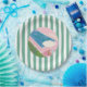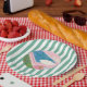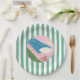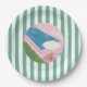 bright fun paper plates with green striped background and pink pool watercolor graphic.