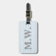 Perfectly preppy light blue and white seersucker striped luggage tag with a grey customizable monogram for the world traveller with a case of wanderlust.