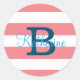 Pastel background in turquoise, navy blue and coral with white stripes and a double monogram in a combination of serif and handwritten script font.