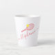 Personalized latte style coffee mug with a girly tennis racket monogram with an elegant script name in pink, green, and white can be changed to any colour, perfect for a women or girls tennis player, coach, instructor, or camp counsellor or team mate.
