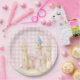 Preppy Watercolor Beach Party Paper Plates. Sand castle on a pink gingham paper plates.