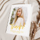 Trendy, modern graduation thank you card featuring the graduate's photo inside of a textured mask frame with "Thanks!" in a yellow handwritten script. Personalize the front of the graduation thank you card by adding the graduate's name and graduation year. The inside of the card features space for your typed or handwritten thank you message.