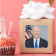 The photograph captures a moment in time during the Presidency Joe Biden the 46th President of the United States. Sunlight streams through a window, casting a warm glow on the figure of an Biden standing confidently in the centre of the frame. Standing tall with arms straight, a gesture that suggests both authority and a hint of casual ease. --- Mr. Biden is dressed impeccably in a dark suit, the crisp fabric contrasting sharply with the clean lines of his white shirt. A blue adds a touch of personality to the ensemble. --- A glimpse of patriotism is evident in the background. An American flag stands proudly on a pole to the man's left, its vibrant colours a subtle counterpoint to the cool blue of the wall behind him. --- Reelection soon to come for President Biden is the focal point of the image. His short white hair frames a kind face, etched with the lines of a life well-lived. A warm smile plays on his lips, conveying a sense of confidence, wisdom, and perhaps a hint of amusement.