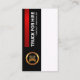A stunning black card accentuated by a faux red gold stripe. At the left wall, lies your prestigious name, job title and a faux gold truck logo that you may use. At the right wall beside the red gold stripe is the slogan "truck for hire" which you may change to suit your business needs. The business name and contact details are at the base.