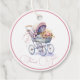 Cute baby shower round favour tags, with graphics of a pretty baby buggy with flowers and bows and a pink rim, around the edge. Personalize the pink custom text to suit your needs. Great on baby shower favours or on special baby shower game prizes.