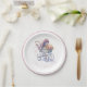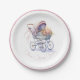 Cute baby shower paper plates, with graphics of a pretty baby buggy with flowers and bows and a pink rim, around the edge. Personalize the pink custom text to suit your needs.