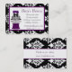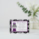Stylish custom bakery business card done with a black and white damask frame and pretty plum purple accents. Graphics of a lovely black and white wedding cake sitting on an up turned purple flower pot, decorates the front of the card. Perfect for a bakery shop, party shop, or an independent custom baker. Customize the text fields to personalize for yourself or your shop.