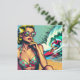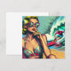 Pretty retro blonde pinup woman sitting on beach with sunglasses watching a hot surfer dude in vintage colours in a pop art comic style.