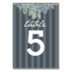 Lovely table number card in soft colour scheme of vintage shades of blue-grey, olive green and dusty purples on a pretty background in a deep grey-blue hue. Original illustration of floral blooms adorn the top front and back of the card with subtle stripe pattern as well. Elegant handwritten look for the fixed text element adds style and grace. Perfect for a spring, summer, outdoor, evening or garden wedding.