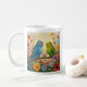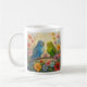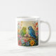 Cute personalized coffee mug for bird lovers with impasto painting style blue and green parakeets and flowers.
