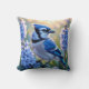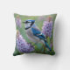 A double-sided throw pillow with two beautiful Blue Jays sitting on a lilac branch.