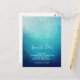 Save the date postcard with a pretty blue half mandala pattern with a background gradient colour of light sea blue transitioning into a dark navy blue. Tranquil and serene.