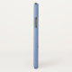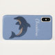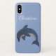 This iPhone X phone case is light blue with a pretty blue and white ocean dolphin with a faux sparkle texture in a jumping position. Customize your name with the template.
