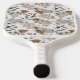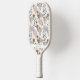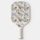 This pretty, stylish pickleball paddle features a boho pattern of tropical flowers and leaves in ivory, copper, gold, gray blue, and teal green over a custom color background (shown in off white). A text template is included for personalization!
