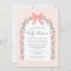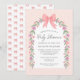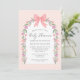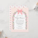 This beautiful baby shower invitation features hand drawn wildflowers in pastel shades of lavender and blush pink, along with a cute satin bow over an arch shaped frame. The back contains a matching bows pattern. Perfect for the mama expecting a little girl!