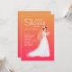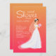 This beautiful bride shower invitation is featured in a floor length gown with a train and veil and holding a bouquet of flowers against a hot pink to peach gradient background. (Vecteezy.com - wedding by freevoctor). The card is easy to customize with your wording, font, font colour, paper shape options and choice of six paper types.