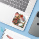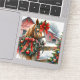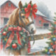 Christmas sticker. A pretty brown horse with a pretty red bow behind a rustic wood fence with a festive wreathe on it. In the background is an old rustic red barn.