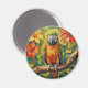 A sweet magnet with an impasto painting style parrot and colorful coral and yellow tropical flowers.