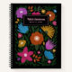 This fun, colourful notebook features a hand drawn floral design in bright colours of magenta / fuchsia pink, orange, golden yellow, purple, blue, and green over a custom colour background (shown in black). Text templates are included for personalization, making this a great gift for back to school, a birthday, Christmas, or any other time!