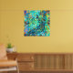 A pretty blue peacock motif against a colourful abstract background, done in bright aqua, yellow, and hints of orange.