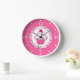 Whimsical pink, green, and white wall clock, with graphics of a cupcake inside a polka dot circle. Number and dots are done in white. Customize to add any text you want. Makes a great gift idea.