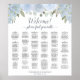 This wedding seating chart is designed in an alphabetical format with a rustic, bohemian chic floral theme. The chart includes a variety of hand-painted watercolor elements such as roses, blossoms, eucalyptus leaves, and foliage in shades of dusty blue and sage green. The heading "Welcome! please find your table" is written in elegant script calligraphy. The chart also features space for the names of the couple and the wedding date, and can accommodate up to 250 guests.