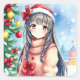 Cute anime girl with Santa hat with red bow with a snowy Christmas tree background. Cute to seal Christmas cards or for stocking stuffers.