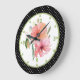 Pretty black and white polka dot wall clock, with a green and white circle, in the middle, with gorgeous watercolor painted flowers. Green hour marks, run around the edge of the white circle. Customize to add your own text to the lovely clock.