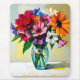 A pretty floral mousepad with an illustration of a colourful vibrant glass vase of flowers done in an ai impasto style oil painting.
