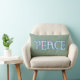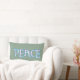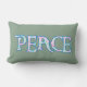 A very pretty lumbar pillow with the word 'PEACE' in a script filled with a pretty pink and blue floral pattern outlined on a soft green background.