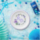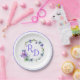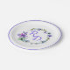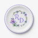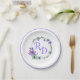 Pretty wedding paper plate done in white, with a colourful floral wreath, with the bride and groom's initials done in lavender and a lavender rim, around the edge of the plate. Personalize the initials for your wedding needs. Matching products are available.