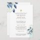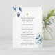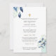 Pretty watercolor flowers, navy and sky blue colours ideal for a fall or winter wedding. Also included pretty sage and olive green greenery and leaves, mason jar, a gold cross, classic elegant design with parents names and customizable scripture. Design by LeahG,