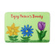 Pretty flowers in the garden green grass with golden yellow flower, blue flower and purple tulip with green leaves. With the wording, Enjoy Nature's Beauty in red script. Shown on a refreshing light green background. Fun and cheery bathroom bath mat to use during the spring and summer months. Leave wording or personalize it or delete text. Lovely for anyone who loves nature and the outdoors. Original Hand-Painted Graphic Artwork by TamiraZDesigns.