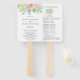 Elegant floral wedding program hand fans with a top border of greenery and watercolor flowers in pink, peach, lavender, white and blue. These wedding hand fans will provide your guests with the order of service and are perfect for a spring wedding.