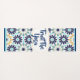 A digital art piece features a vertical rectangle filled with a geometric pattern, set against a plain white background. The rectangle's pattern consists of repeating star-shaped motifs in a palette of navy blue, turquoise, and golden yellow. The stars are arranged in a symmetrical grid, with each star composed of multiple pointed shapes radiating from a central point. The spaces between the stars are filled with smaller geometric shapes in the same colours, creating a cohesive and intricate design. The top and bottom edges of the rectangle are bordered with a solid navy-blue line, framing the pattern within. The overall style is clean and modern, with a focus on geometric precision and colour harmony.