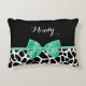 A girly black and white giraffe print accent pillow with a pretty mint green ribbon tied into a cute bow. Personalize this trendy animal print design by adding your name. The mint green on the reverse side can be customize with your own custom colour. Flat printed image, not actual bow.