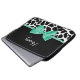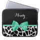 A girly black and white giraffe print 15'' laptop sleeve with a pretty mint green ribbon tied into a cute bow. Personalize this trendy animal print design by adding your name. Flat printed image, not actual bow.