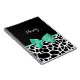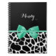 A girly black and white giraffe print notebook with a pretty mint green ribbon tied into a cute bow. Personalize this trendy animal print design by adding your name. Flat printed image, not actual bow.