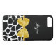 A trendy black and white giraffe print Barely There iPhone 7 Case with a girly golden yellow ribbon tied into a chic bow. Personalize this stylish animal print mobile device case by adding your name. Flat printed image, not actual bow.