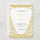 The invitation features a mostly white background, adorned with an elaborate and gorgeous gold art deco border, which exudes a sense of glamour and opulence. The intricate geometric patterns and sparkling gold details create a lavish frame for your personalized information, setting the stage for a truly unforgettable wedding celebration.