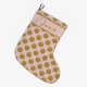 Festive Christmas stocking with gold faux glitter snowflake pattern on a pretty pastel pink background. Personalize with a name in a fun script style of lettering in gold.