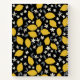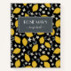 Yellow and black recipe book printed with a charming pattern of lemons and flowers in yellow, grey, and white. Personalize with your name in elegant retro letters. Recipe book is written in a charming script.