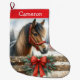 A pretty brown horse behind a rustic wooden fence with a red bow and wreath personalized Christmas stocking.