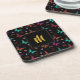 Cute elegant personalized coasters with a monogram initial inside a black frame with a gold coloured border. Designed with an elegant pattern with a graphic illustration of fluttering butterflies in many bright colours, contrasting very nicely on the black background. Whimsical florals, sprigs and leaves add a bit of charm.