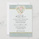 Softly greyed silver sage green background for a trending wedding palette of green and white. Modern style wreath in a heart shape that was created out of individual flowers and leaves. Beautiful and intricate lace pattern is featured on both sides of the invitation. Art copyright, Audrey Jeanne Roberts.