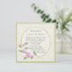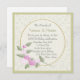 Pretty square floral birthday invitation has a Victorian era elegant. The square invitation has a tiny tan on cream floral background, with a round text area decorated with a sprig of pretty pink flowers. Customize the text for your party celebration, with text colours, text size, font style, and wording.
