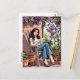 A postcard to keep in touch with a friend. A pretty ai illustration of a woman sitting outside on her patio relaxing, with a cup of warm coffee and her dog sleeping at her feet. She is surrounded by lovely potted and hanging plants.
