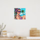 Fun summer vibes poster with a pretty lady in a purple polka dot bikini on the beach in a tropical comic book style.