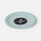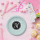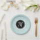 Romantic paper plates with mint blue floral wreath and personalized monogram.